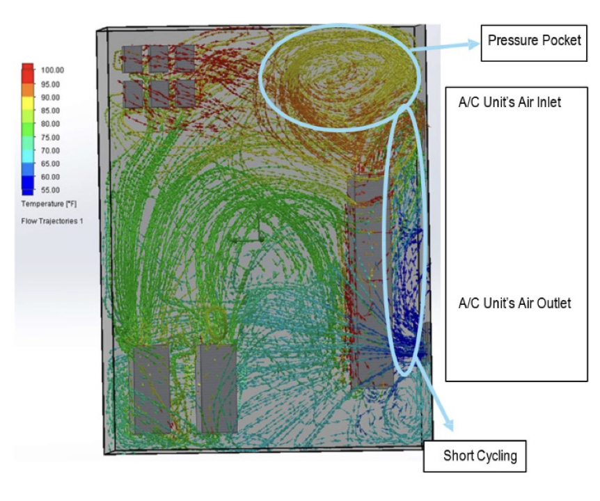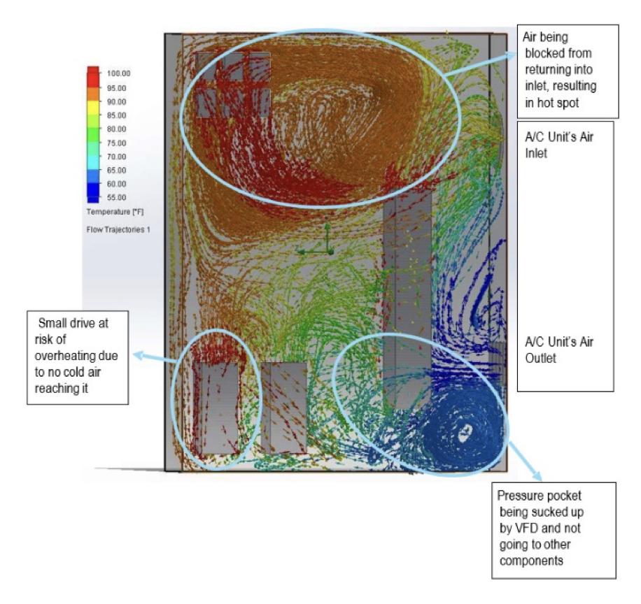 This means that the A/C unit is failing to remove the heat from the cabinet as well as placing a strain on the A/C unit’s compressor for it to turn on and off in consecutive use, which could lead to potential icing inside of the A/C unit’s air outlet. A pressure pocket forms in the top right hand corner of the enclosure due to the drive’s exhaust being sucked directly into the A/C unit’s fan inlet and blocking the airflow path for the hot air to return to be cooled by the A/C unit.