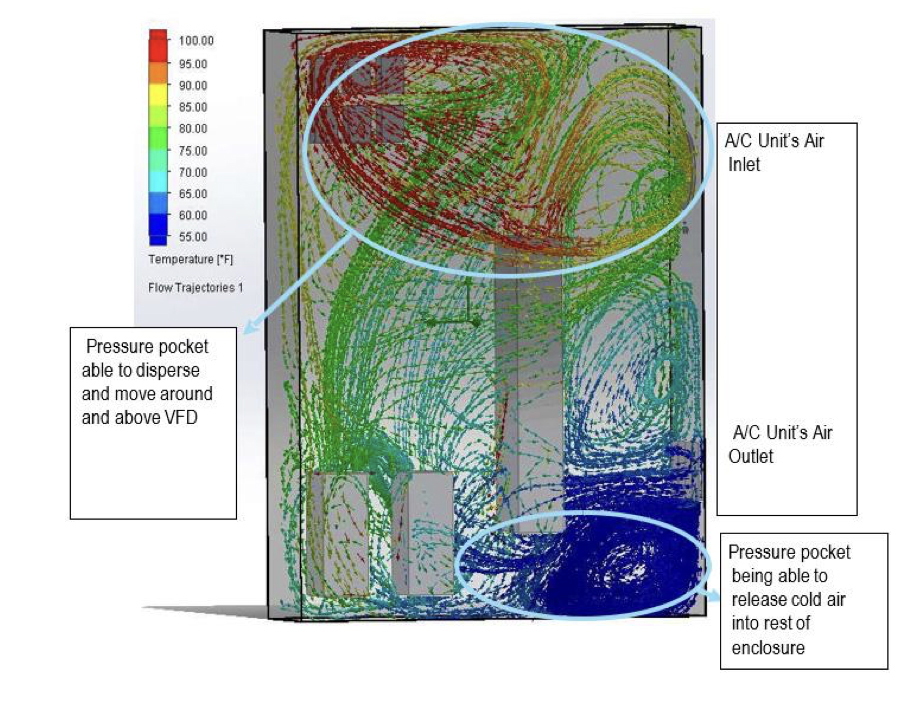 Scenario #3 presents the least possible likelihood of short cycling cold air being redirected into the A/C unit and all components have airflow going to them. Scenario #1, had the highest chance of short cycling overall which would cause the unit to shut off early and not cool the enclosure to the desired temperature. Scenario #2 featured a large pressure pocket of hot air that would not be able to cycle correctly and would end up causing most of the contactors to overheat.