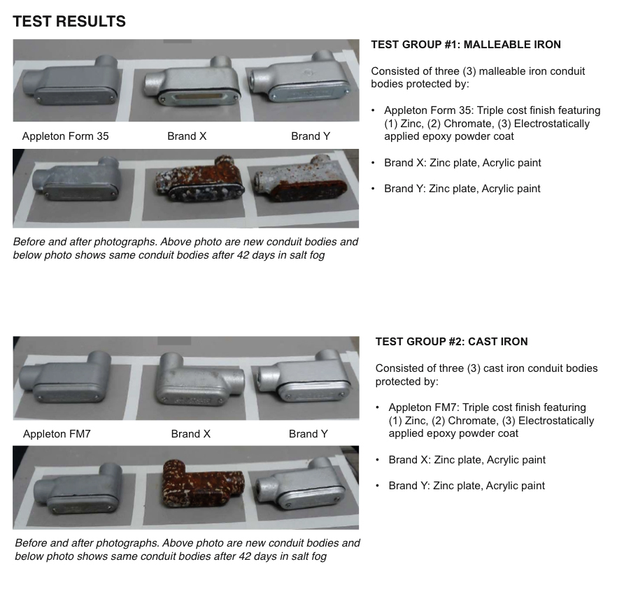 In order to determine the corrosion resistance of various protection methods used on conduit bodies, Emerson turned to Intertek, an independent Total Quality Assurance provider to industries worldwide with more than 1000 laboratories and 44,000 employees. Intertek conducted ASTM-B117 Salt Fog performance testing on iron conduit bodies from three major manufacturers. A total of 39 conduit bodies were tested, all in the 3/4-inch trade size.