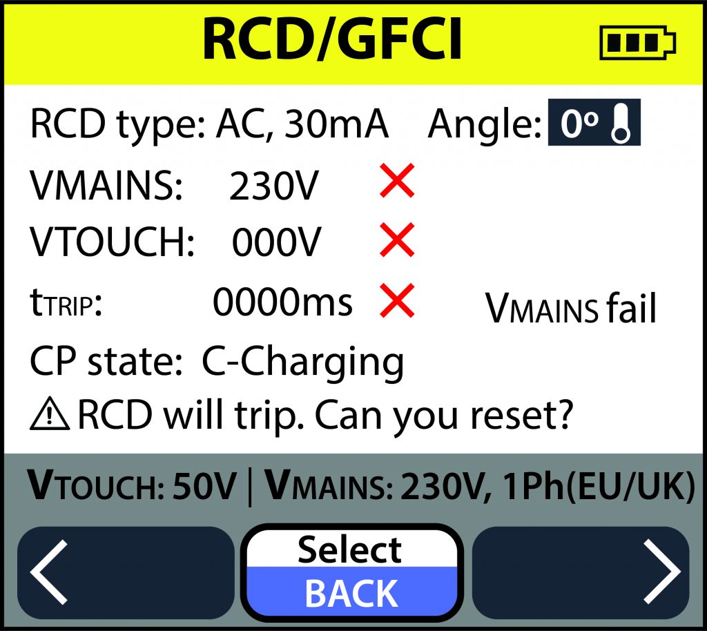 Should the charger fail to switch on the output voltage, the test will stop. This could indicate a connection or fuse problem. Should the touch voltage test fail, this indicates poor connection to protective earth. A qualified electrician should examine for repair. The RCD or GFCI is checked according to pre-set limits based on line voltage, indicated by green check or red X. The latter indicates replacement with new GFCI or RCD.