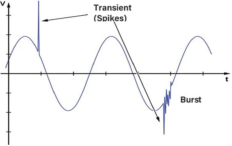 Transients – which are also called spikes – can have an effect on equipment and installations that ranges from mildly irritating to extremely damaging and costly. An electrical transient is a very fast, short duration spike in voltage that can be several thousand volts in magnitude. It may be a single event, but it can also come in bursts. The voltage spike produces an increase in current in the load, seen as a current spike, which results in a momentary increase in the energy transferred from the supply to the load. Depending on the magnitude and duration of the transient, the amount of extra energy may be no consequence, or it may be enough to cause serious damage.