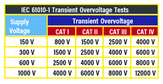 The need for transient protection in instruments is reflected in the international electrical standard IEC 61010 entitled “Safety requirements for electrical equipment for measurement, control, and laboratory use”. This requires test equipment to be able to withstand levels of transients appropriate to the point in the installation where the instrument will be used. (See table)