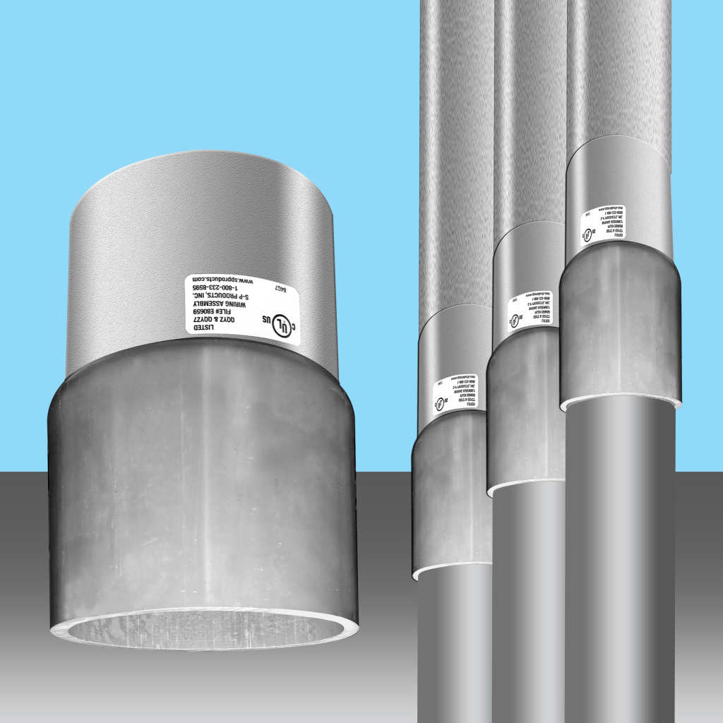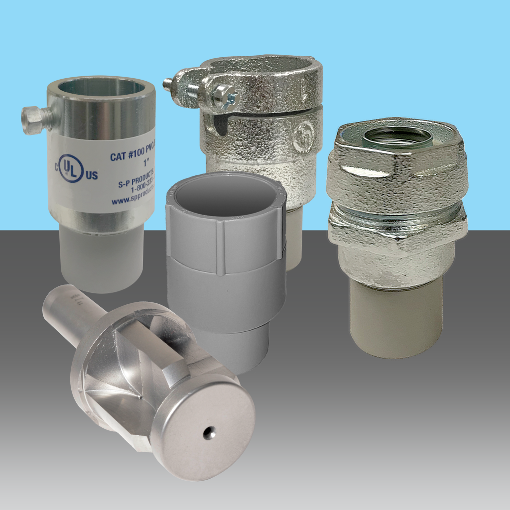 Transitioning or change overs above the slab is made fast and easy using SP’s transition coupling family (IP13) with, or (IP12) without reaming out the PVC conduit penetrating the slab. Cut schedule 40/80 PVC flush to the slab and ream out with our reaming bits (IP15) and glue and install the appropriate UL Listed Transition coupling to continue the run with desired conduit above the deck.