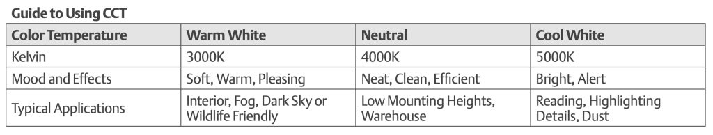 Correlated Color Temperature (CCT) refers to the color appearance or the look and feel of the light source. The cooler or crisper the appearance of a light source means the higher the CCT measured in Kelvin (K). Many LED luminaires offer more than one color temperature to suit application needs and customer preferences.