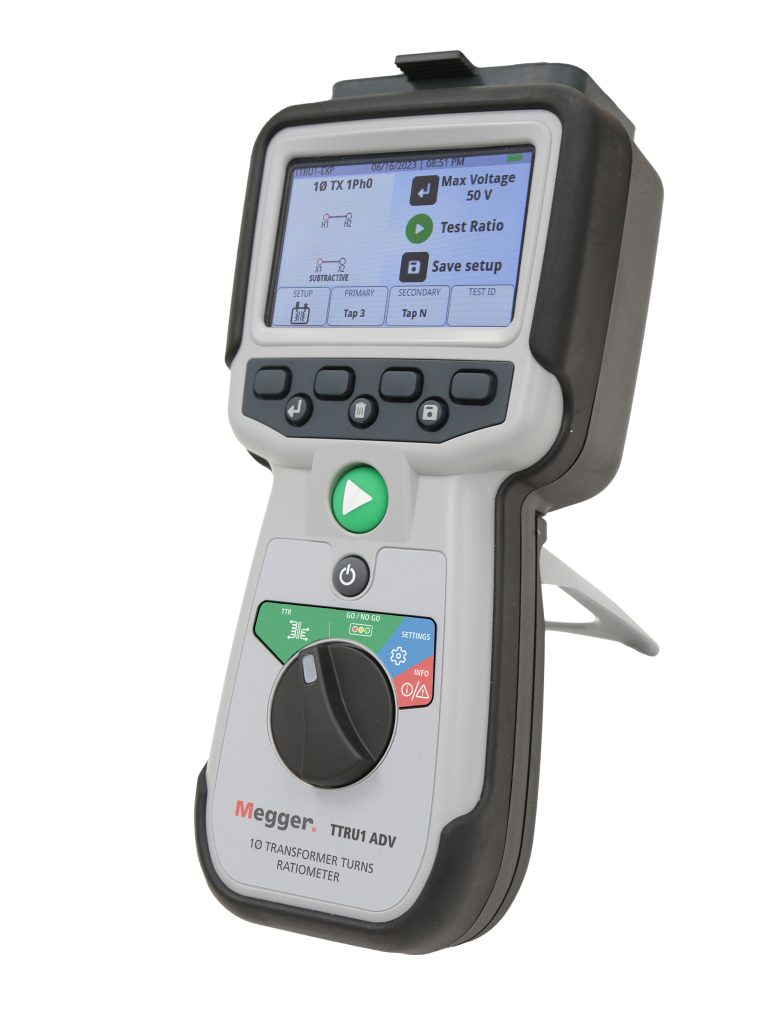 Modern Turns Ratio Testers can now be handheld instruments. They include battery-powered single-phase models that are quick and convenient to operate, up to 250 V AC with 0.05% accuracy. They can be used on single- and 3-phase distribution, power and instrument transformers for ratio, polarity and verification. Dedicated instructions guide the operator through 3-phase setup and application so that no operator error threatens the success of the test. The operator is not required to know the test voltage, as modern instruments utilize single-phase step-up ratio technologies to overcome voltage dependence when testing large transformers. The prospect of operator error is further reduced by color-coded leads and customizable on-screen vectors and voltages to match the transformer’s nameplate.