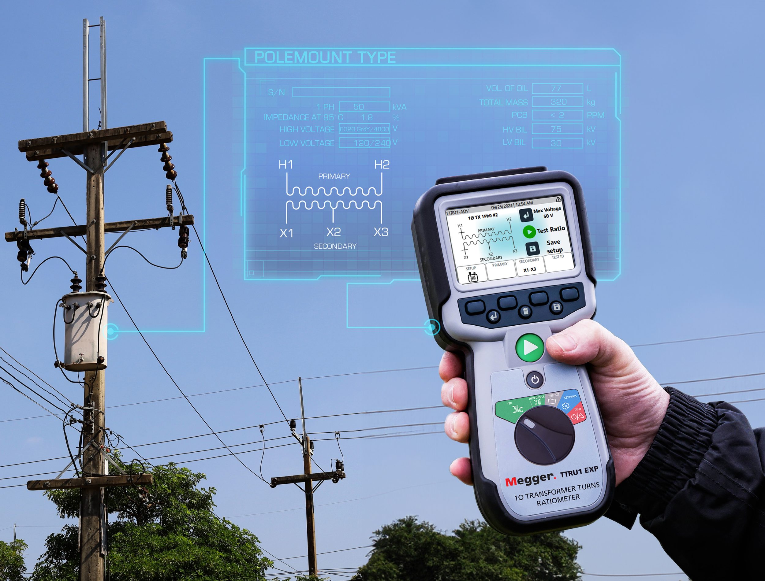 Modern Turns Ratio Testers can now be handheld instruments. They include battery-powered single-phase models that are quick and convenient to operate, up to 250 V AC with 0.05% accuracy. They can be used on single- and 3-phase distribution, power and instrument transformers for ratio, polarity and verification. Dedicated instructions guide the operator through 3-phase setup and application so that no operator error threatens the success of the test. The operator is not required to know the test voltage, as modern instruments utilize single-phase step-up ratio technologies to overcome voltage dependence when testing large transformers. The prospect of operator error is further reduced by color-coded leads and customizable on-screen vectors and voltages to match the transformer’s nameplate.