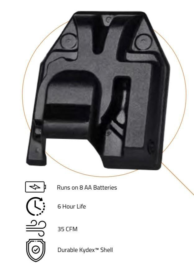 The Cementex ventilation system features a durable Kydex™ shell and runs on AA batteries for 6 hours, reaching thirty five CFM.