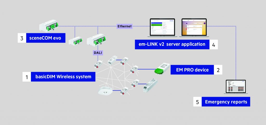 MODERN EMERGENCY AND SAFETY LIGHTING requires central monitoring and automatic testing of individual luminaires. In the case of existing systems, retrofitting is often difficult as additional wiring is needed for communication. Tridonic can remedy this with its new wireless emergency lighting system. It combines the proven Tridonic technologies of basicDIM Wireless and sceneCOM and is suitable for both renovations and new installations.