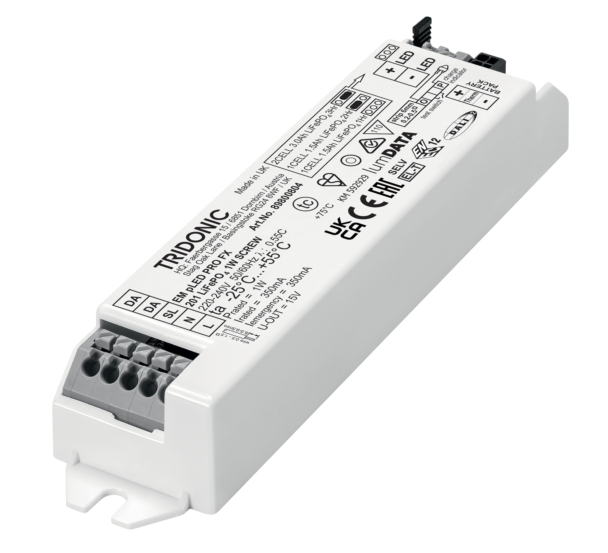 The EM powerLED PRO LiFePO4 1-4W driver marks a new generation of self-contained emergency lighting LED drivers that has been developed for emergency luminaires and emergency exit luminaires. The drivers, containing sustainable lithium iron phosphate batteries (LiFe- PO4), are the first emergency lighting LED drivers to be certified to DALI-2 Part 202. The drivers also bear the lumDATA label – Tridonic’s mark to indicate compliance with the three main DALI or D4i specifications for data collection: DALI Part 251 (luminaire data), DALI Part 252 (energy data) and DALI Part 253 (diagnostics data). That means the benefits of lumDATA now apply to emergency lighting applications too: luminaire data allows installed luminaires to be monitored efficiently, while greatly simplifying luminaire commissioning and maintenance. Energy data shows the consumption of each luminaire in the entire installation. Diagnostics data is used for predictive maintenance, because it re- cords errors in defective devices such as overvoltage or overtemperature.