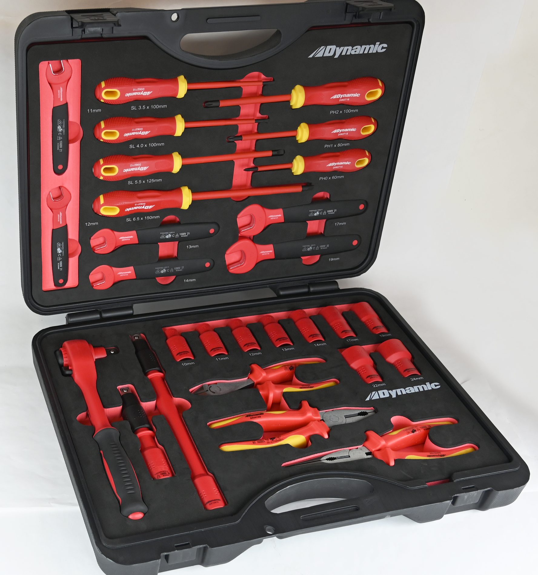 Dynamic’s new insulated tool set includes a 1/2” drive ratchet with a selection of extensions and six-point metric sockets. It also contains open-ended metric wrenches, slotted screwdrivers, Phillips screwdrivers, side-cutting pliers, lineman’s pliers and long-nose pliers. All pieces are precision machined to meet the needs of the most demanding professionals.