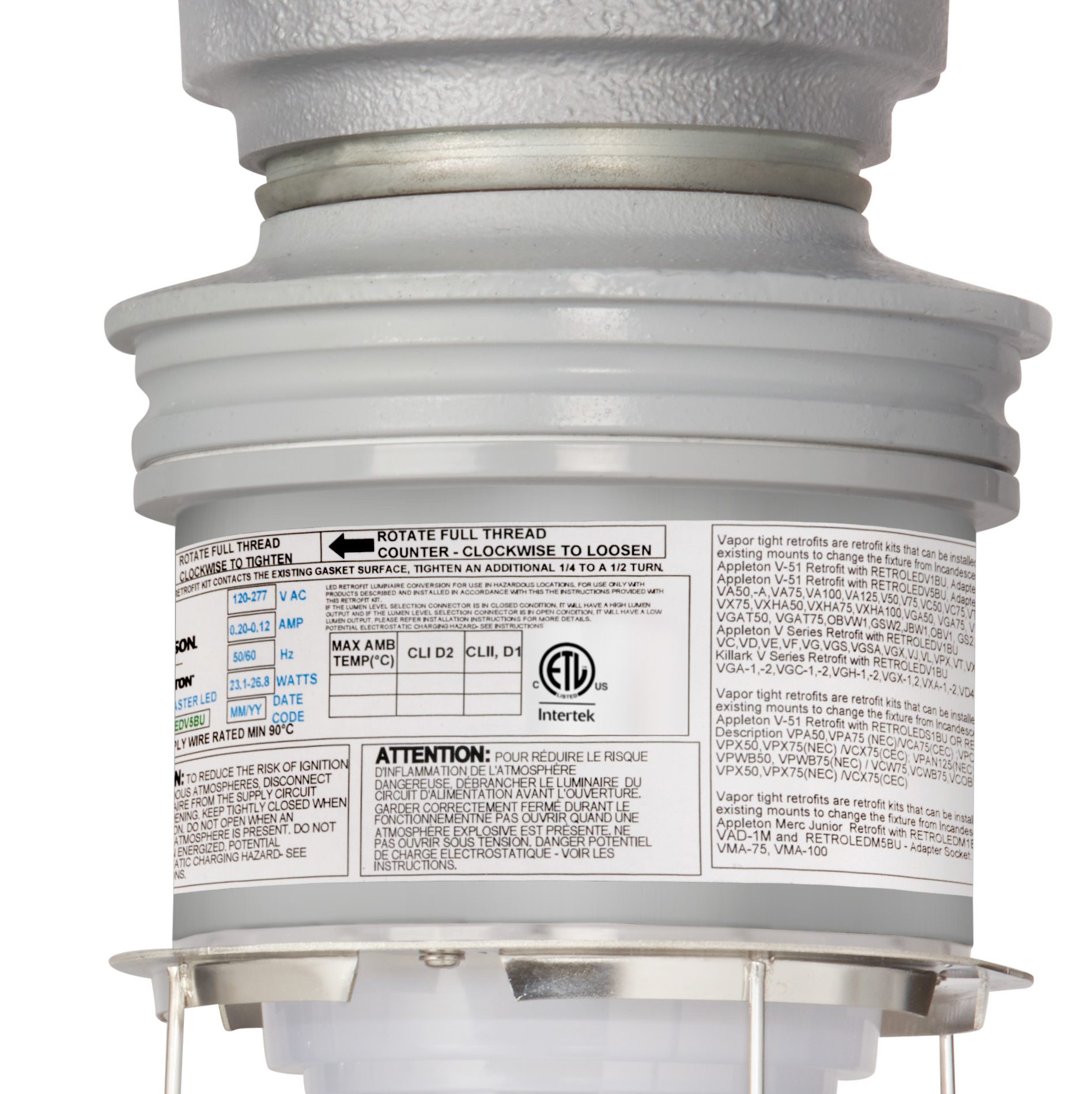 Requiring no time-consuming rewiring or cutting of conduit, Appleton Retromaster luminaires typically take only a few minutes to install onto an existing mounting hood, dramatically reducing labor and material expenses. The luminaires are available in an output range from 1000 to 5000 lumens, and each of the four models comprising the Retromaster Series offers the unique versatility of selectable dual lumen outputs, ensuring that the illumination level of the new LED fixture is identical to the one being replaced — a first for hazardous location rated lighting. Once installed, the Appleton Retromaster requires only 7 to 38 Watts to create the same level of illumination as an incandescent drawing 60 to 300 Watts, representing a huge improvement in energy efficiency.