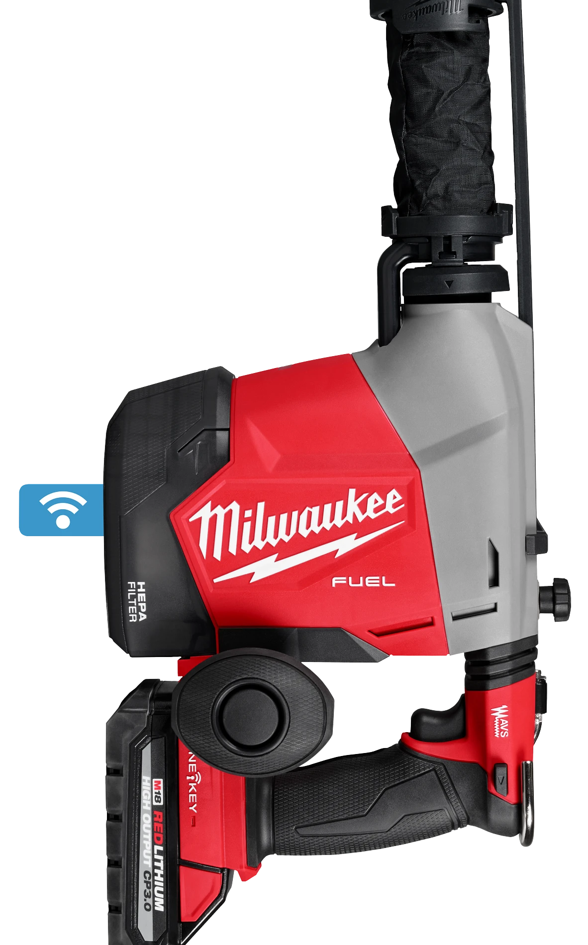 The M18 FUEL™ Overhead Rotary Hammer with Integrated Dust Extraction is a new-to-world solution that delivers superior ergonomics for overhead drilling and simplified dust collection. The built-in dust extractor creates a lighter weight and more balanced design, while the new side handle design allows the operator to maintain better posture throughout the application for lower fatigue. AUTOSTOP™ Kickback protection offers enhanced safety for the operator by preventing over-rotation in a bind-up. The POWERSTATE™ Brushless motor provides the fastest drilling for small ceiling anchors and enough power to complete up to 5/8” holes in concrete.