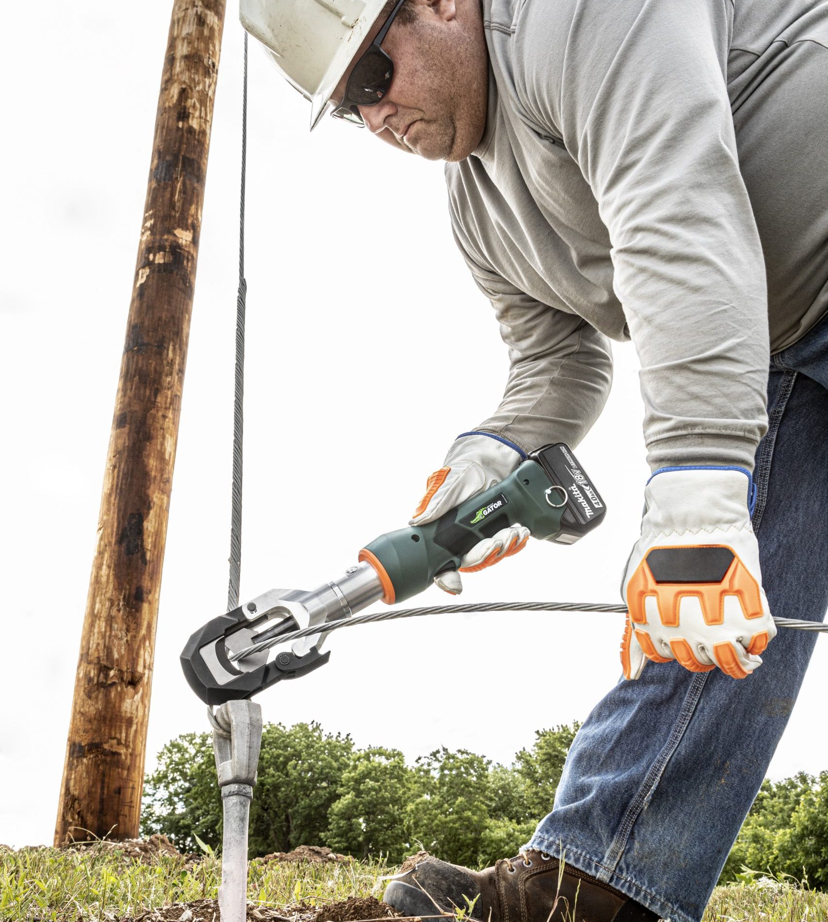 The ESG45LX is ideal for overhead one-handed operation and cuts up to 1/2-inch Rebar (Schedule 60) and EHS Guy Strand and 5/8-inch Ground Rod and Standard Guy Strand. It has a compact, lightweight design, weighing less than eight pounds with battery, and is 33 percent lighter than an earlier model thanks to a redesigned flip-top style latch that reduces overall weight.